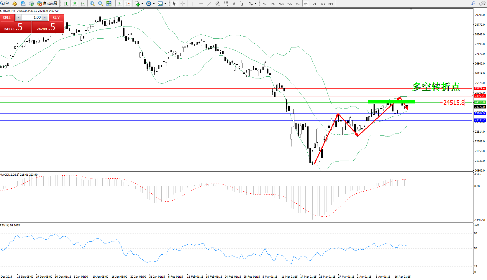 恒指HK50 ——4小时K线图显示: