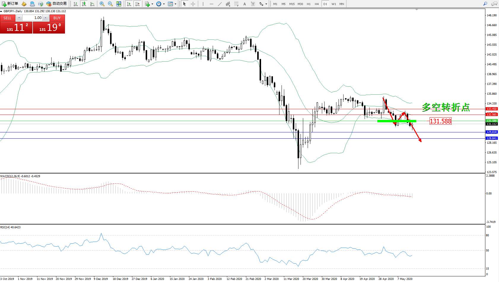 交易策略:131.588下方看跌,目标129.818128.841