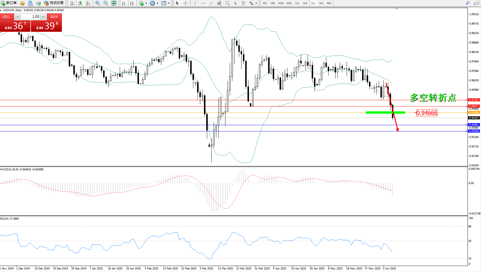 交易策略:0.94666下方看跌,目标0.93961、0.93600