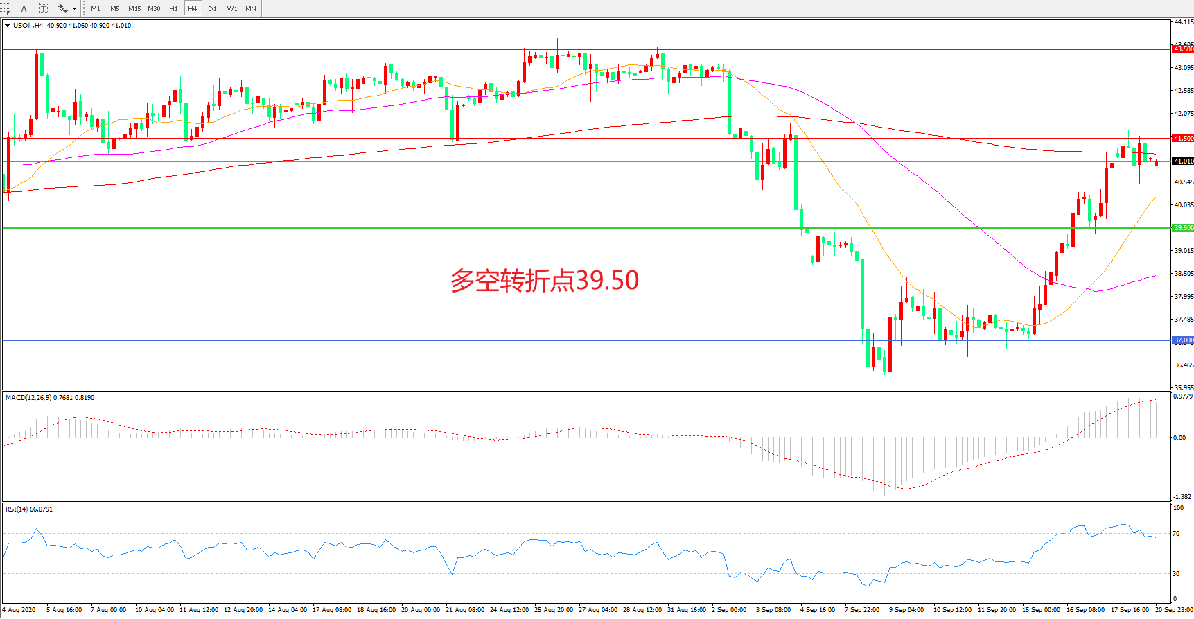 4小时图看,油价盘整后连续拉升,短期表现强势,41.5美元成为短期阻力,均线系统拐头向上,MACD红柱增加,日内延续上行概率较大。
