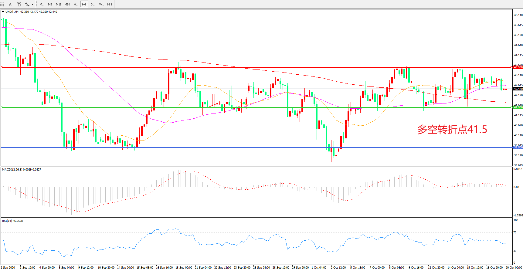 交易策略:  在41.50之上看涨,目标43.50      46.50