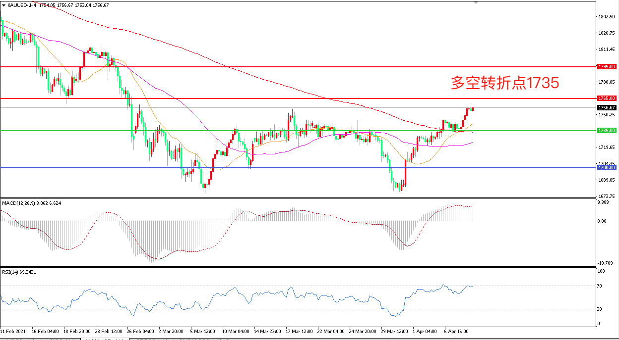 周四(48日),虽然美国初请失业金人数意外不降反增,但美联储再次释放宽松信号,美联储主席鲍威尔称,全球新冠疫苗接种发展不均威胁到经济复苏,通胀料将暂时上行。受此影响,美债收益率回落,美元下行提振金价表现,现货黄金大涨逾20美金,收报1754.09美元/盎司。