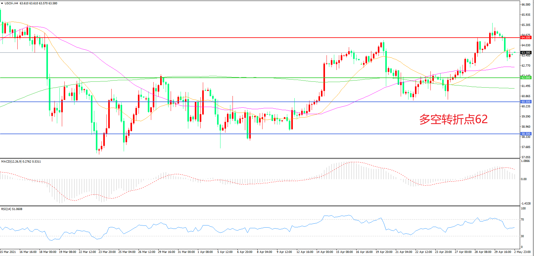 4小时图看,油价突破64.5美元后冲高回落,多头趋势有所放缓,但下方支撑依然坚挺,均线系统走平,MACD红柱缩短,RSI指标向上,日内震荡上行概率较大。