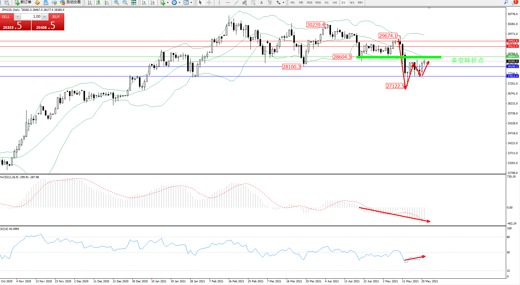 日经225指数5月21日(周五)收盘上涨226.25点,涨幅0.81%,报28324.50点。日本核心消费物价在4月连续第九个月下降,表明需求疲软和成本上升将拖累脆弱的经济复苏。5月份企业投入成本上涨、工厂活动扩张步伐放缓,显示严重依赖制造业的日本经济面临风险。数据突显了决策者面临的挑战。他们既要应对新冠肺炎感染激增的局面,同时又要避免阻碍经济成长。在从新冠疫情引发的危机中复苏方面,日本已经落后于其他主要贸易伙伴。4月份通胀率是下降了,但这几乎完全是由于手机资费锐减所致。抛开暂时性的扭曲,基本通胀率将继续进一步有所上升,不过不同于其他一些发达经济体的情况。