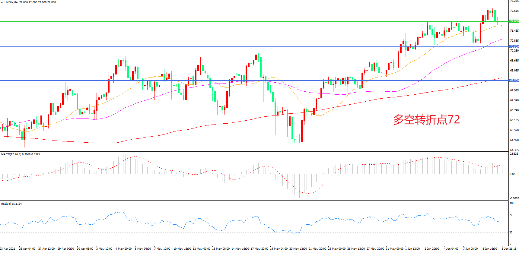4小时图看,油价延续高位震荡,整体表现偏强,21周期均线成为下方支撑,72美元成为中期多空分水岭,MACD红柱减少,RSI指标走平,日内延续震荡概率较大。
