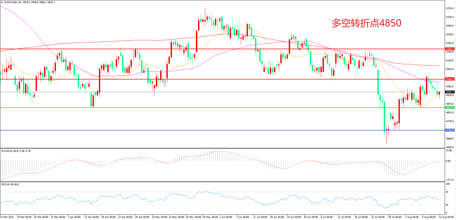 4小时图看,沪深300大幅反弹后受阻于5000点附近阻力,上行势头受阻,55均线成为短期阻力,21周期均线成为下方支撑,MACD绿柱缩短,日内延续震荡概率较大。