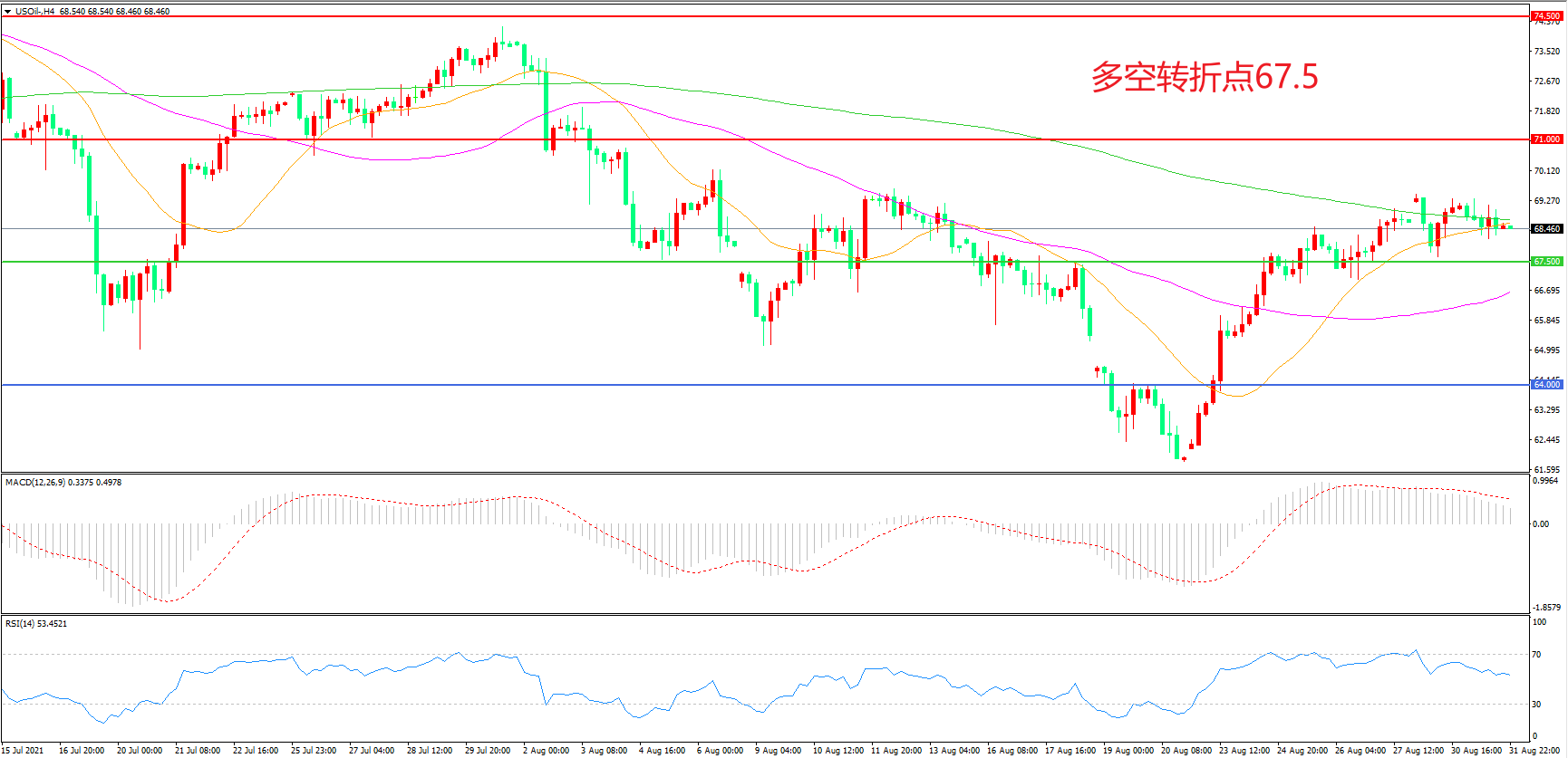 4小时图看,油价突破67.5美元后延续高位震荡,整体表现偏强,200周期均线成为争夺焦点,71美元成为上方阻力,MACD红柱增加,RSI指标走平,日内震荡上行概率较大。