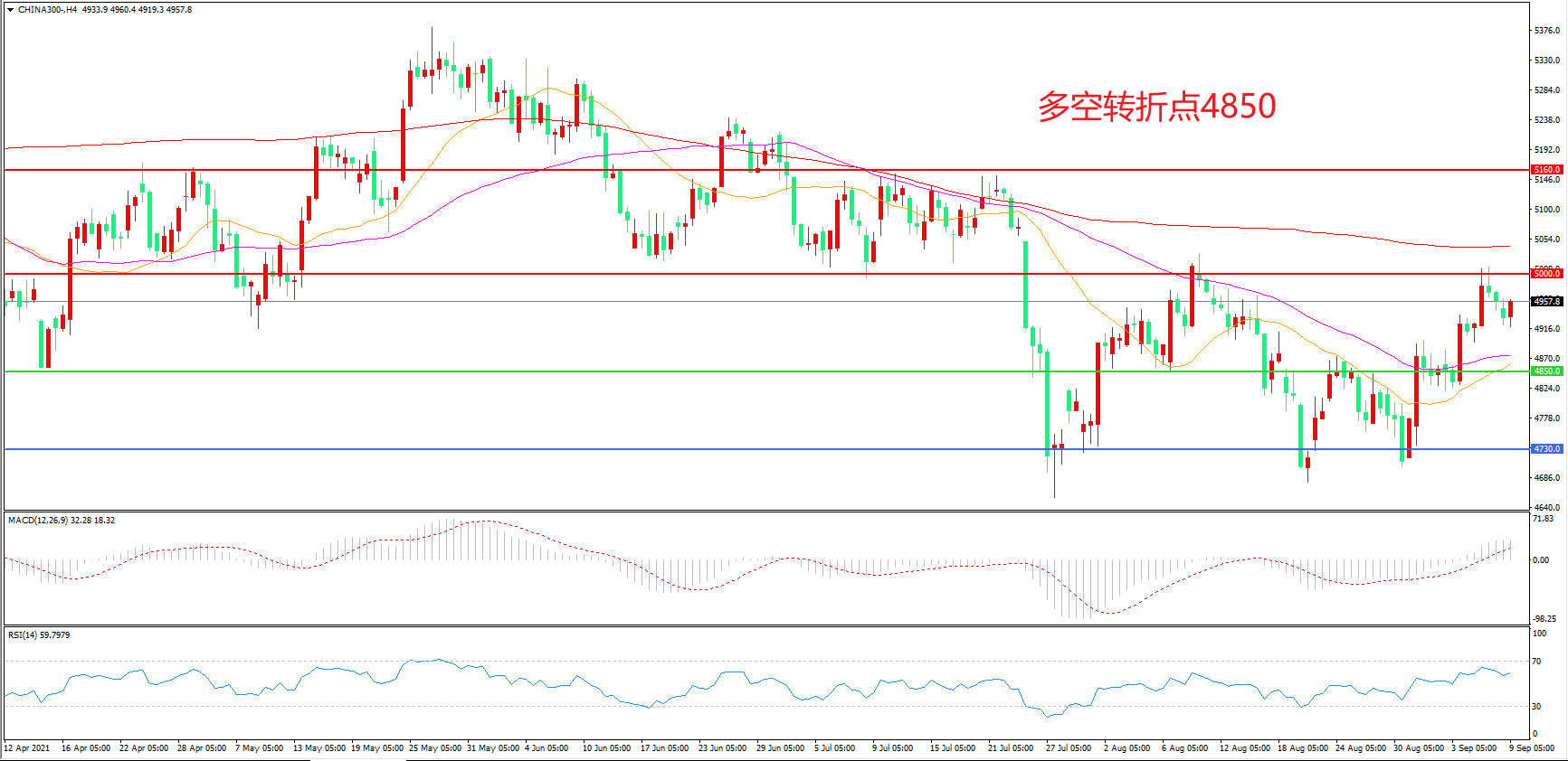周四(9月9日),沪指早盘横盘震荡,结构性行情明显,临近尾盘,沪指突然拉升,向3700点整数关口进攻,走出漂亮的翘尾行情,沪深300顺势拉升,收报4957.8点。两市合计成交超1.4万亿,北向资金全天净流入60亿。目前沪指面临重要压力位时资金的态度有所分歧,沪深300 短线或将继续在5000点一线上下震荡。
