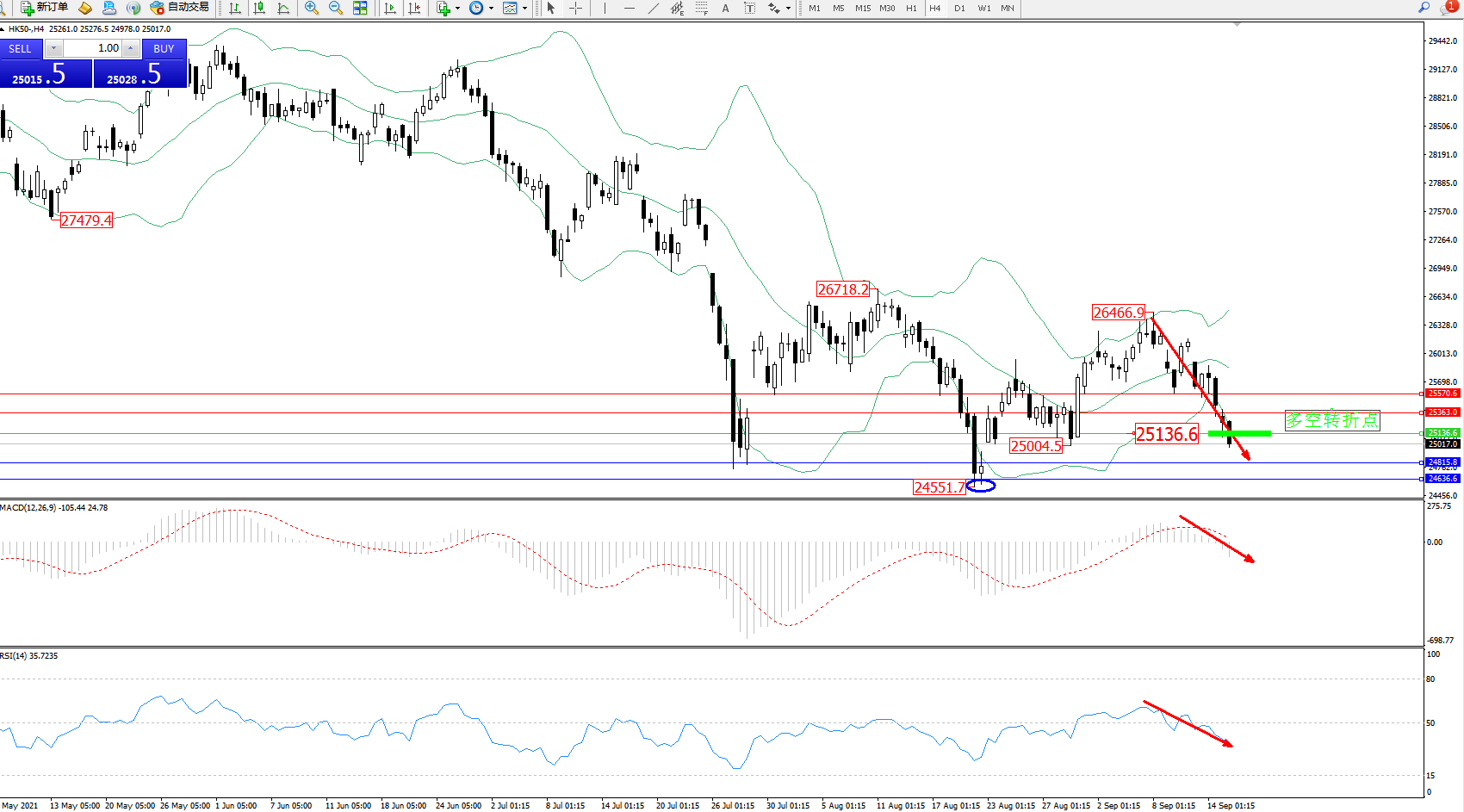 恒指HK50 ——4小时K线图显示: