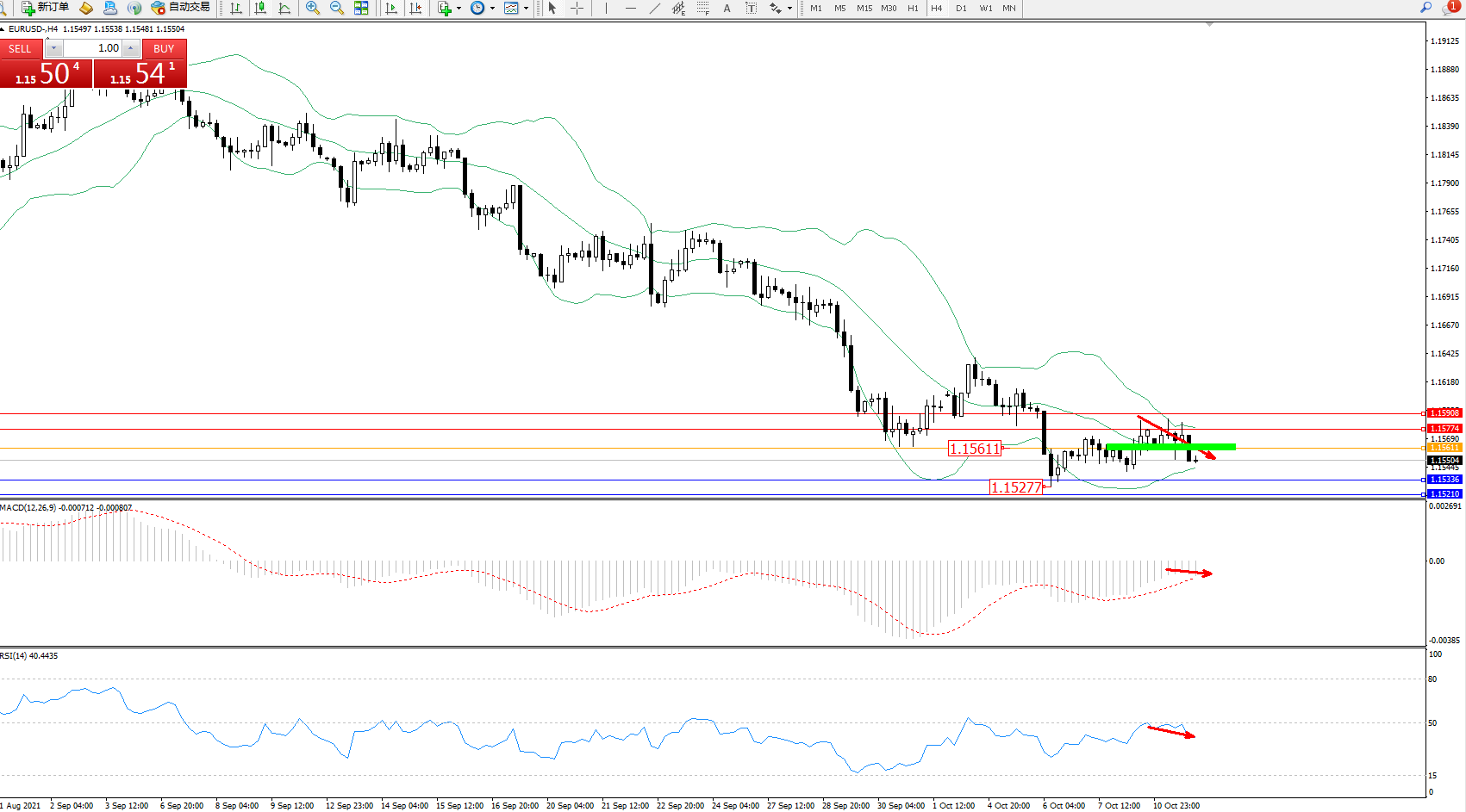 技术点评:空头动力延续布林带指标通道内持续震荡下行,低位抵达1.15277位置后开始维持窄幅整理持续平移中,短期空头下行动力开始得到短暂支撑,但下行趋势或将有延续下行迹象,布林带指标呈收口走势持续走平中,MACD指标处于空头区域低位震荡上移后开始整理平移,RSI指标处于50均衡线下方弱势徘徊中;