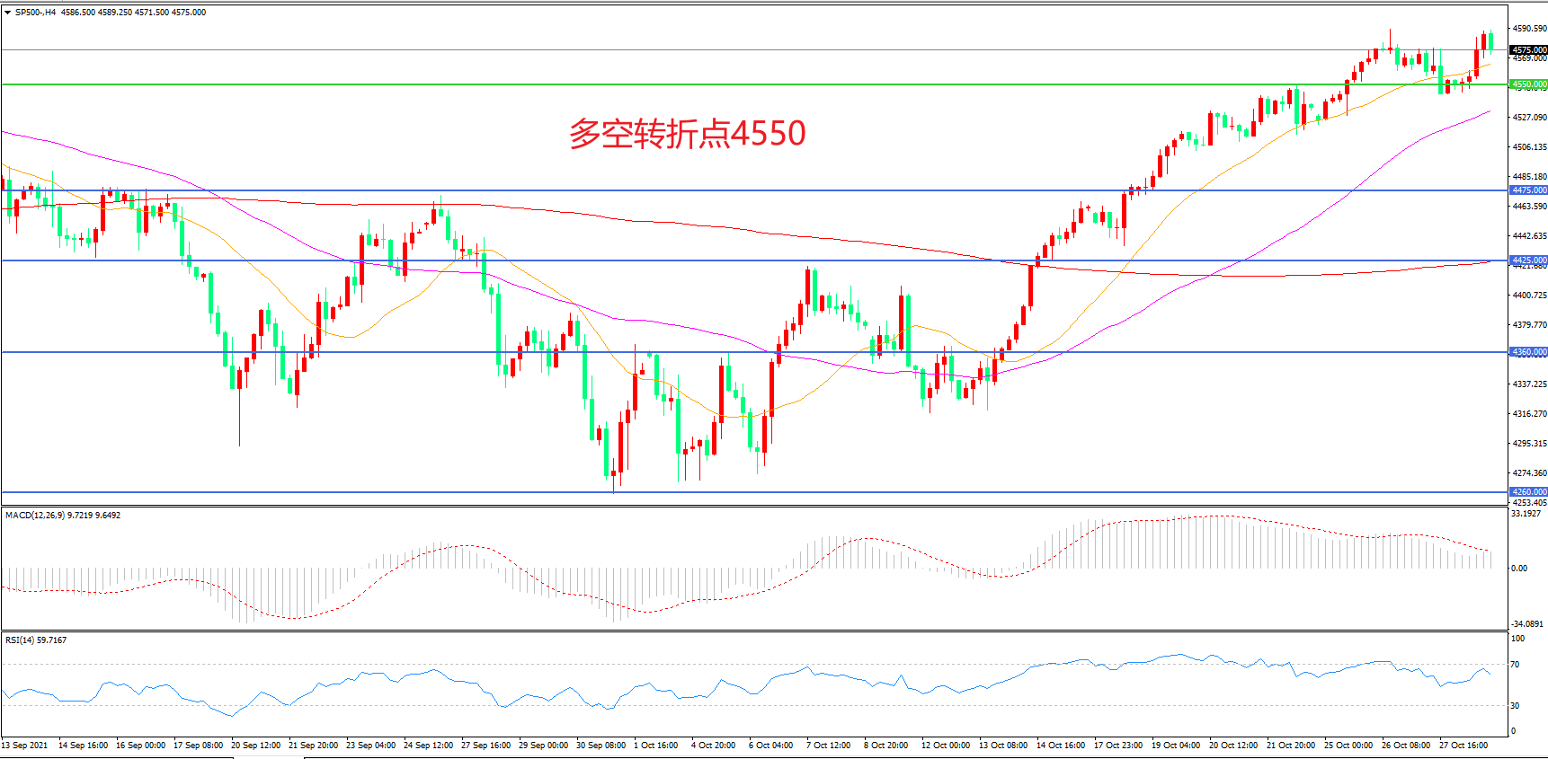 4小时图看,标普500回踩4550支撑后再度拉升,短期表现偏强,均线系统呈多头排列,MACD红柱增加,RSI指标走平,日内延续上行概率较大。