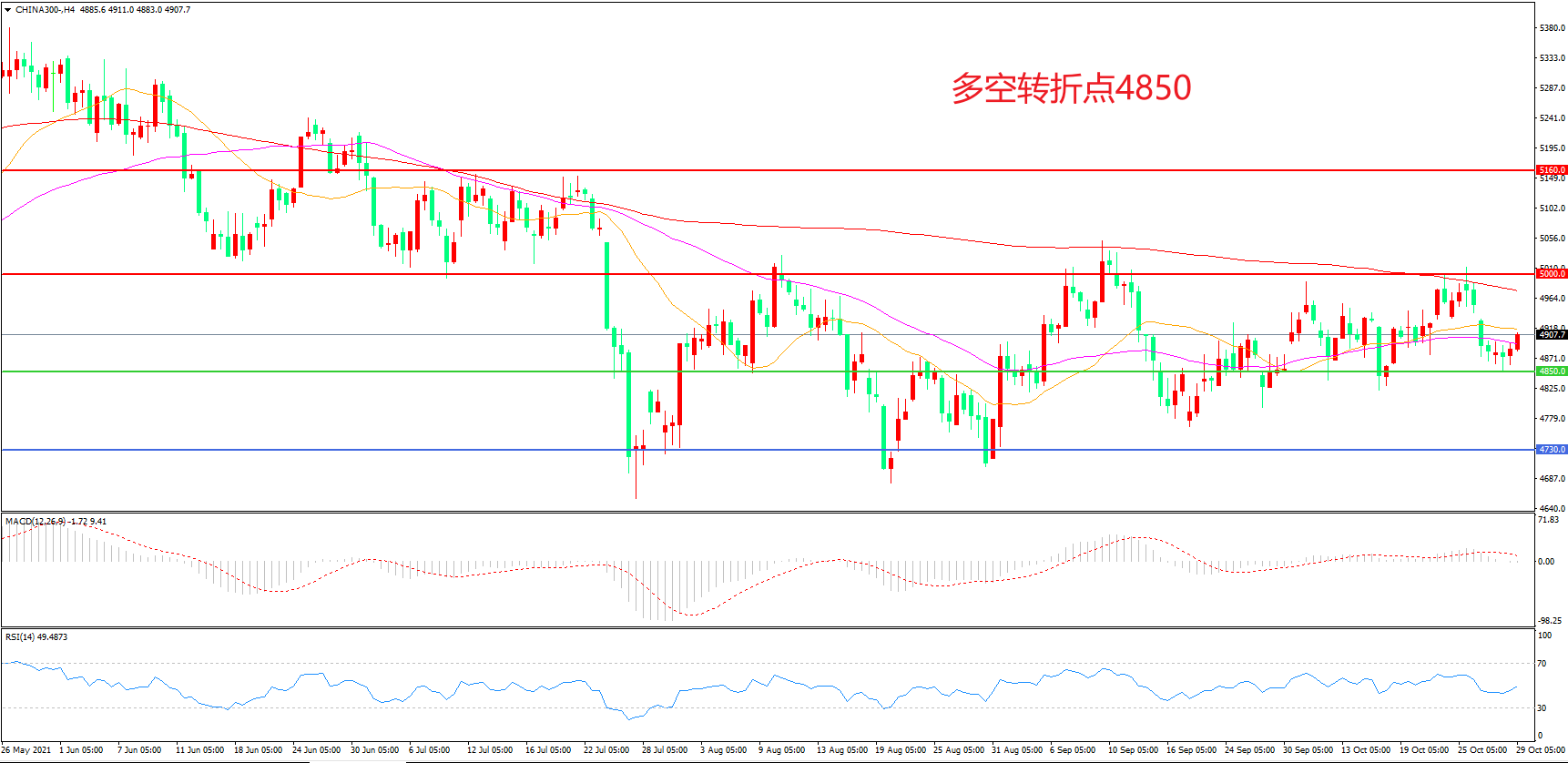4小时图看,沪深300延续区间震荡形态 ,4850成为下方支撑,200周期均线成为上方阻力,均线系统走平,MACD红柱减少,RSI指标向上,日内延小幅上行概率较大。