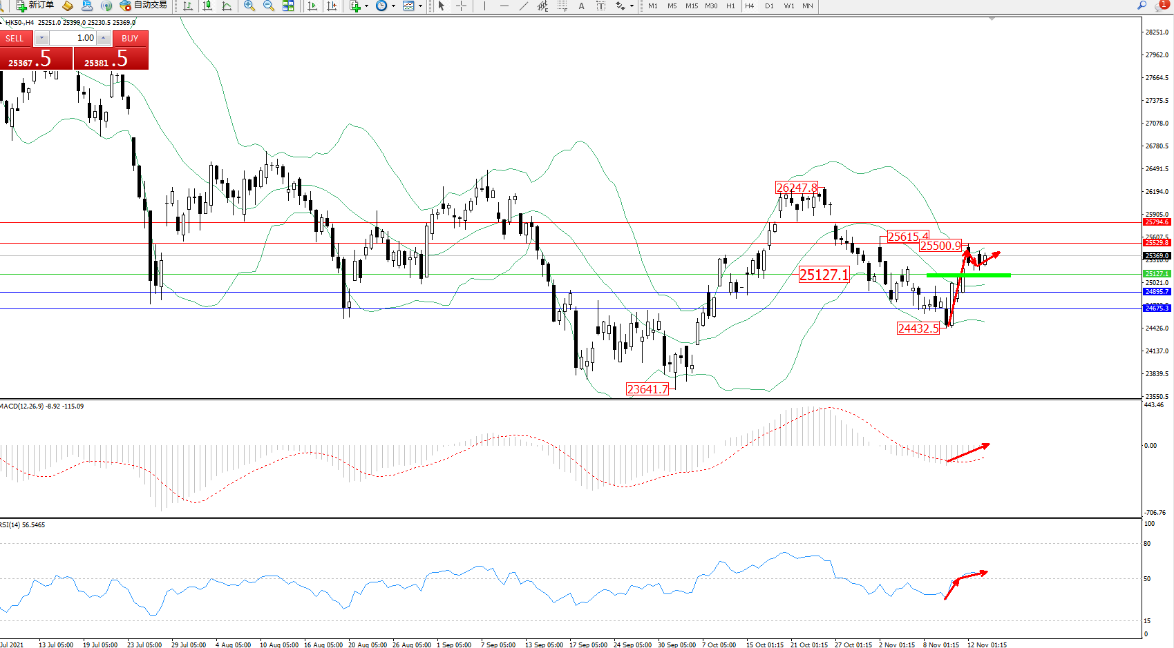 恒指HK50 ——4小时K线图显示: