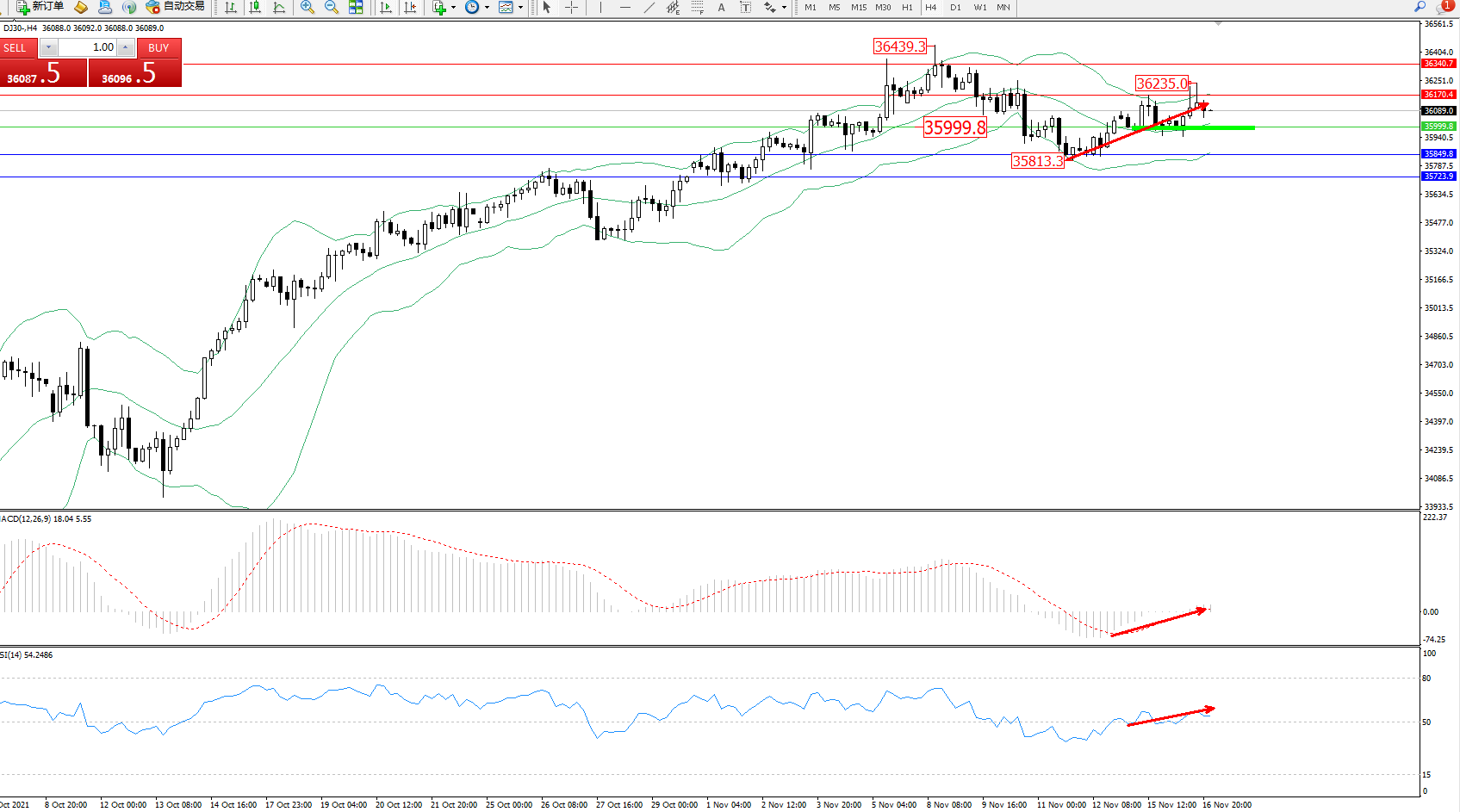 道琼斯指数DJ30——4小时K线图显示: