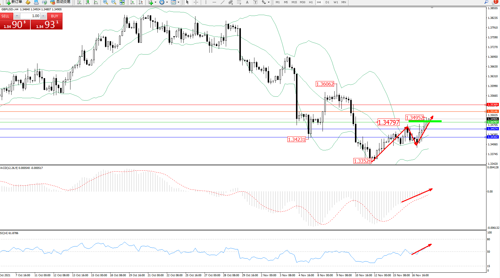 交易策略:1.34797上方看涨,目标1.35146、1.35369