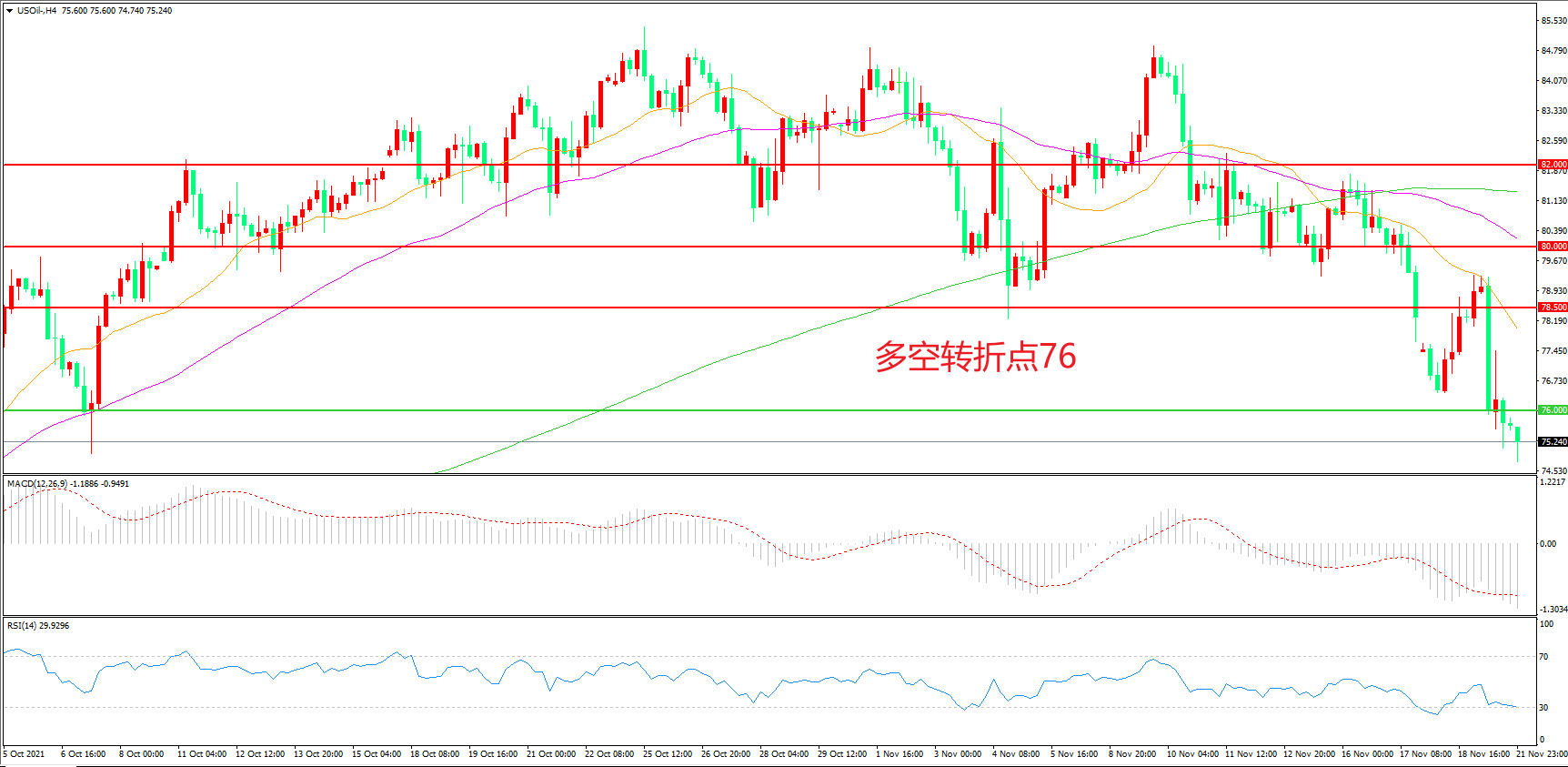 上周,欧洲疫情告急引发市场对需求受创的担忧,奥地利宣布重启全国封锁并成为首个强制接种的欧洲国家,美国WTI原油跌逾4%后收报75.63美元/桶。随着时间进入到年底,全球需求出现一定的放缓,在美国极力压低油价的情况下,未来市场的不确定性将会加大,市场波动率也会提升,投资者还需要注意市场风险,谨防突然性的消息大幅打压油价。
