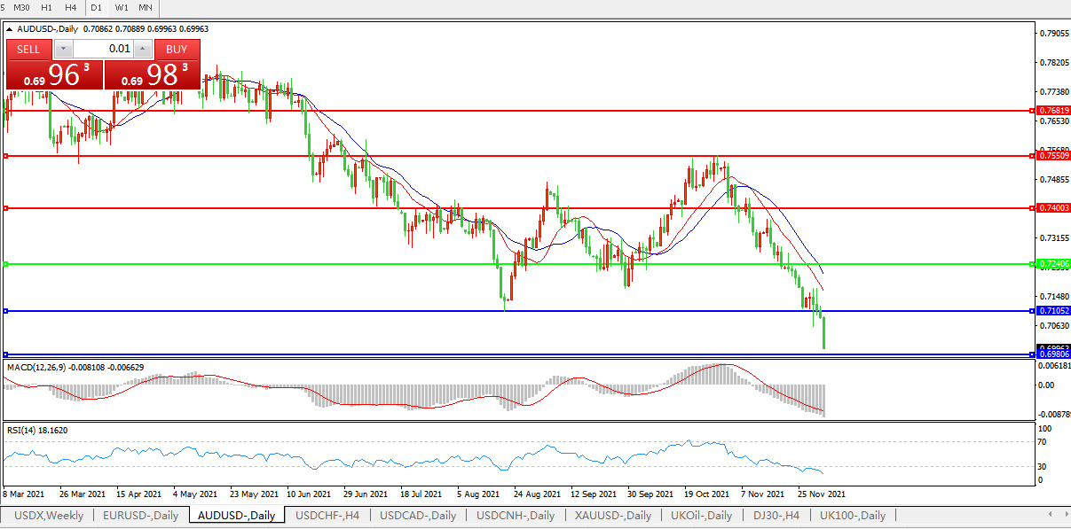 澳元兑美元、纽元兑美元分别下跌约1.3%和0.9%;澳元连续第四天下跌,跌至2020年11月以来最低水平。
