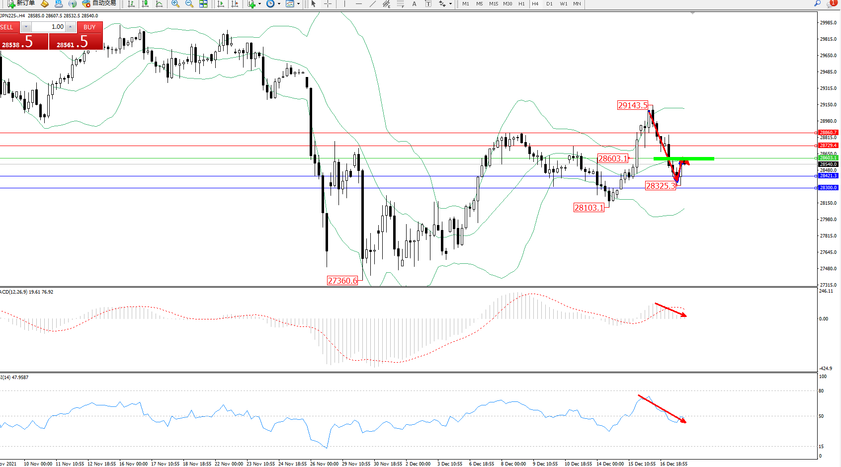 日经指数JPN225——4小时K线图显示: