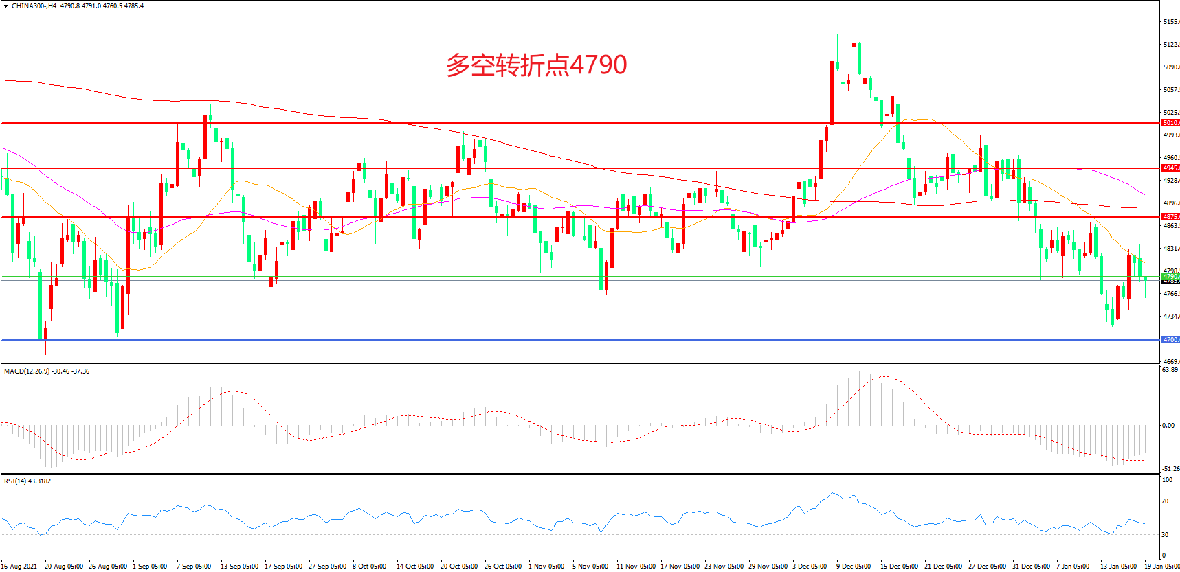 4小时图看,沪深300呈现宽幅震荡形态,但始终受制于21周期均线,整体走势偏空,MACD绿柱缩短,RSI指标走平,日内延续震荡概率较大。