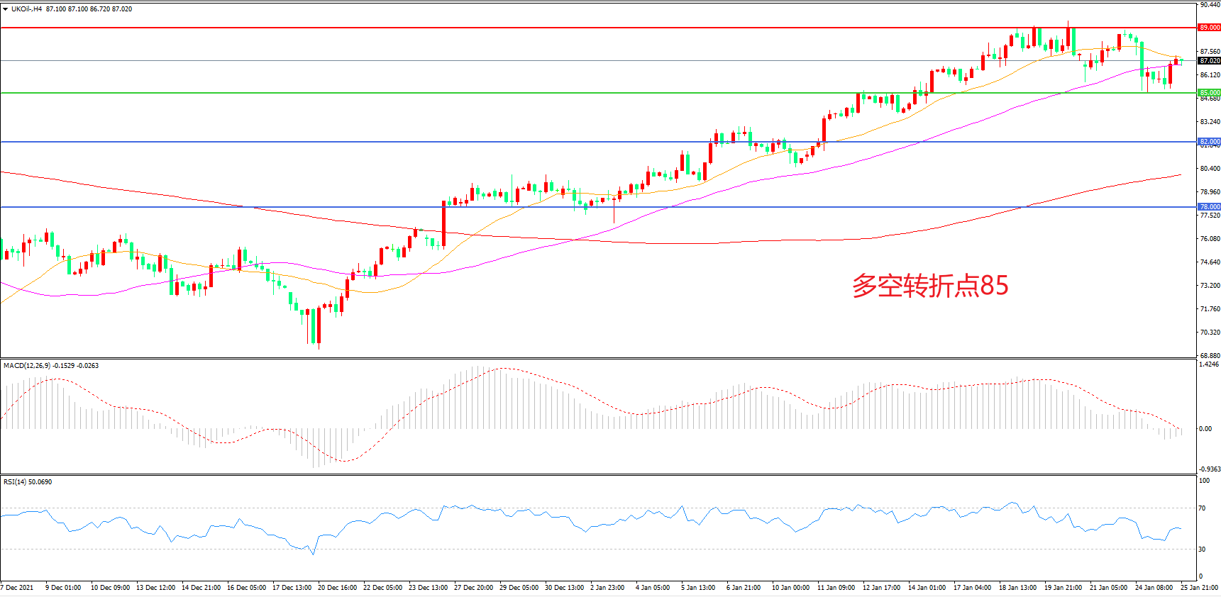 4小时图看,油价回踩85美元一线后再度上行,短期走势回暖,均线系统成为下方支撑,MACD红柱缩短,RSI指标走平,日内震荡上行概率较大。