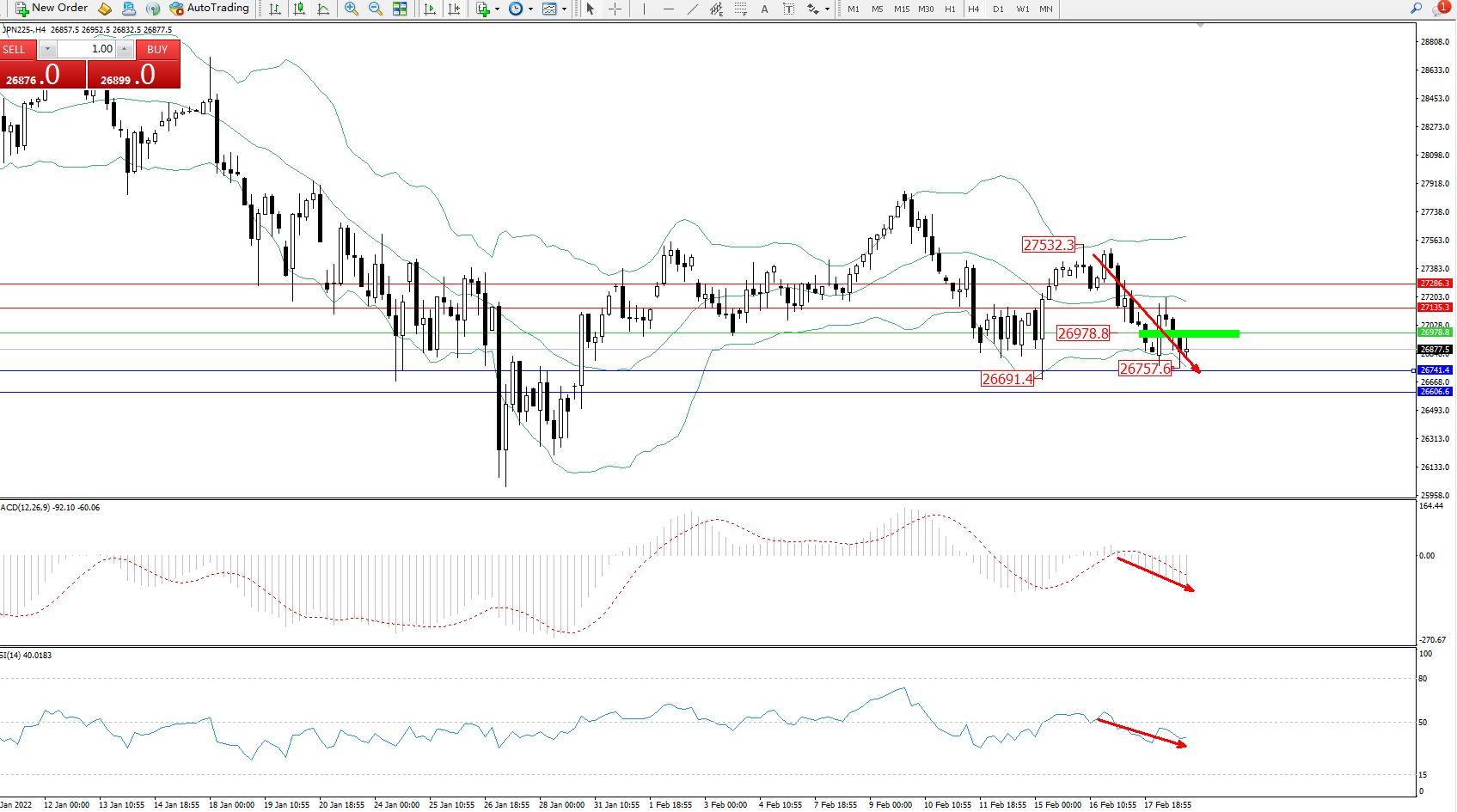 日经指数JPN225——4小时K线图显示: