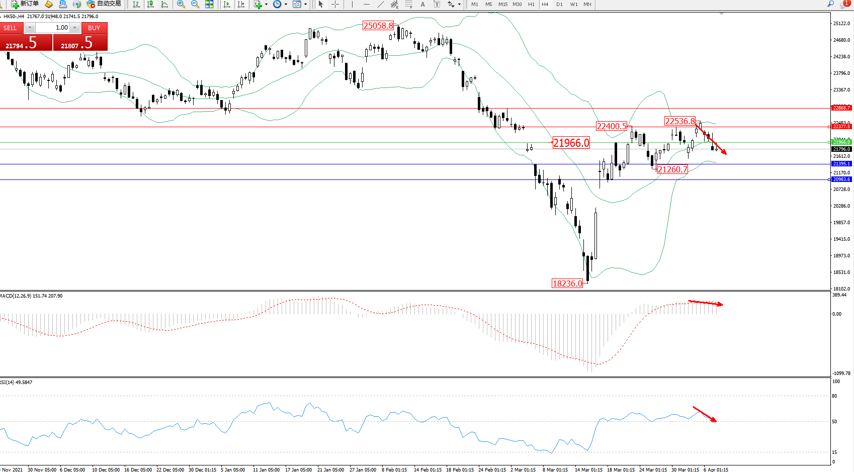 恒指HK50 ——4小时K线图显示: