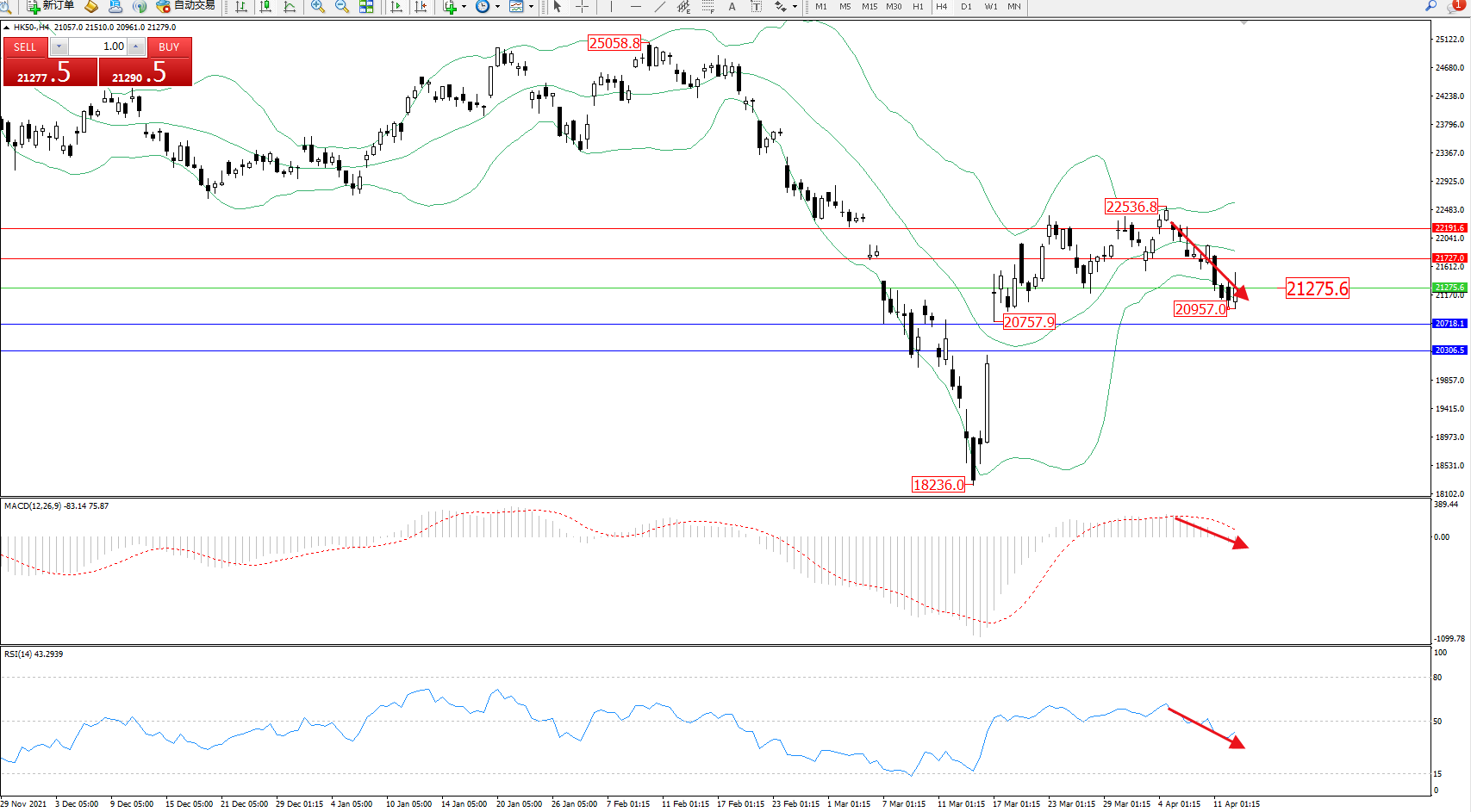 恒指HK50 ——4小时K线图显示: