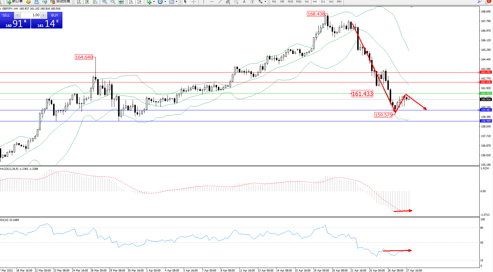 交易策略:161.433下方看跌,目标159.982、158.999