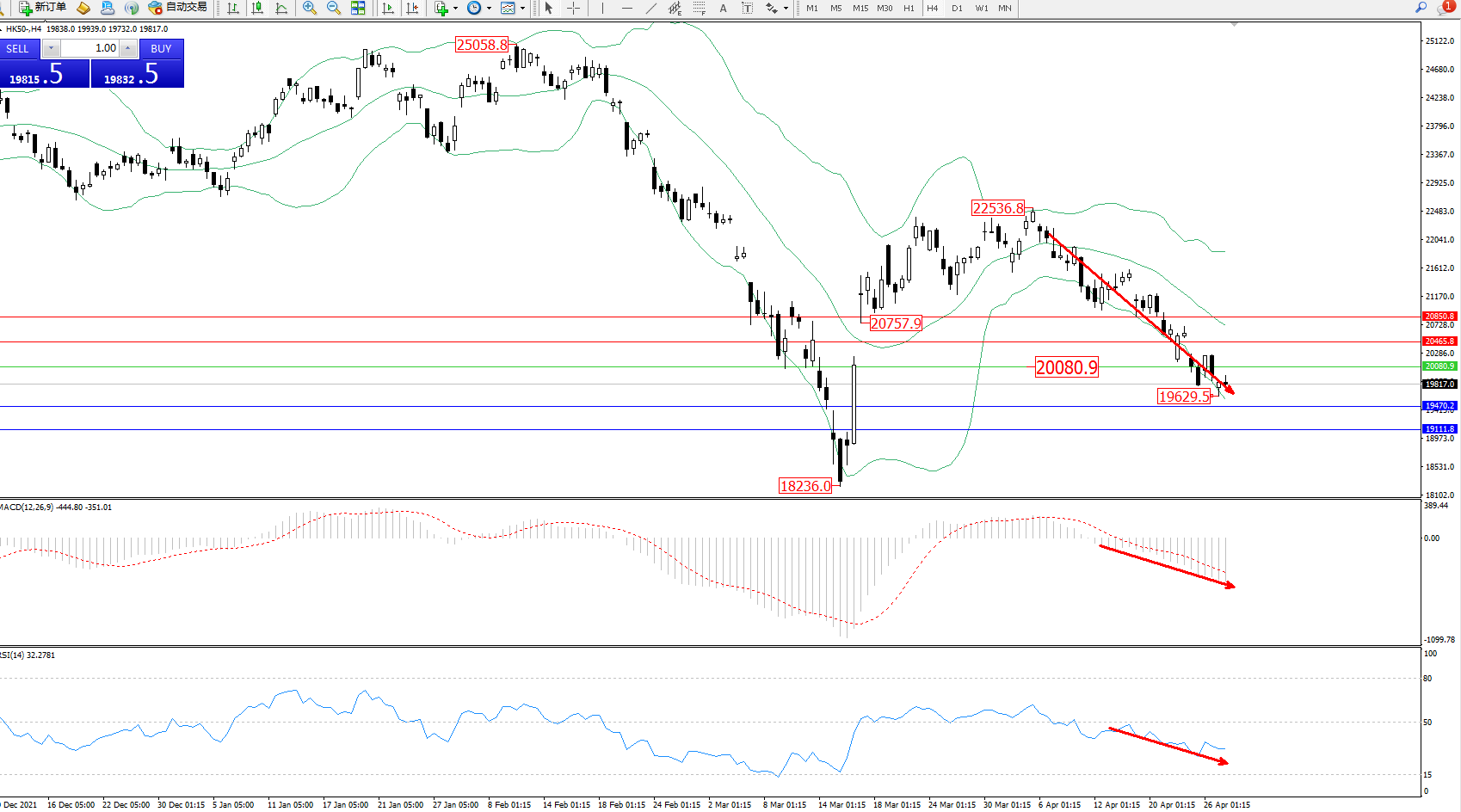 恒指HK50 ——4小时K线图显示: