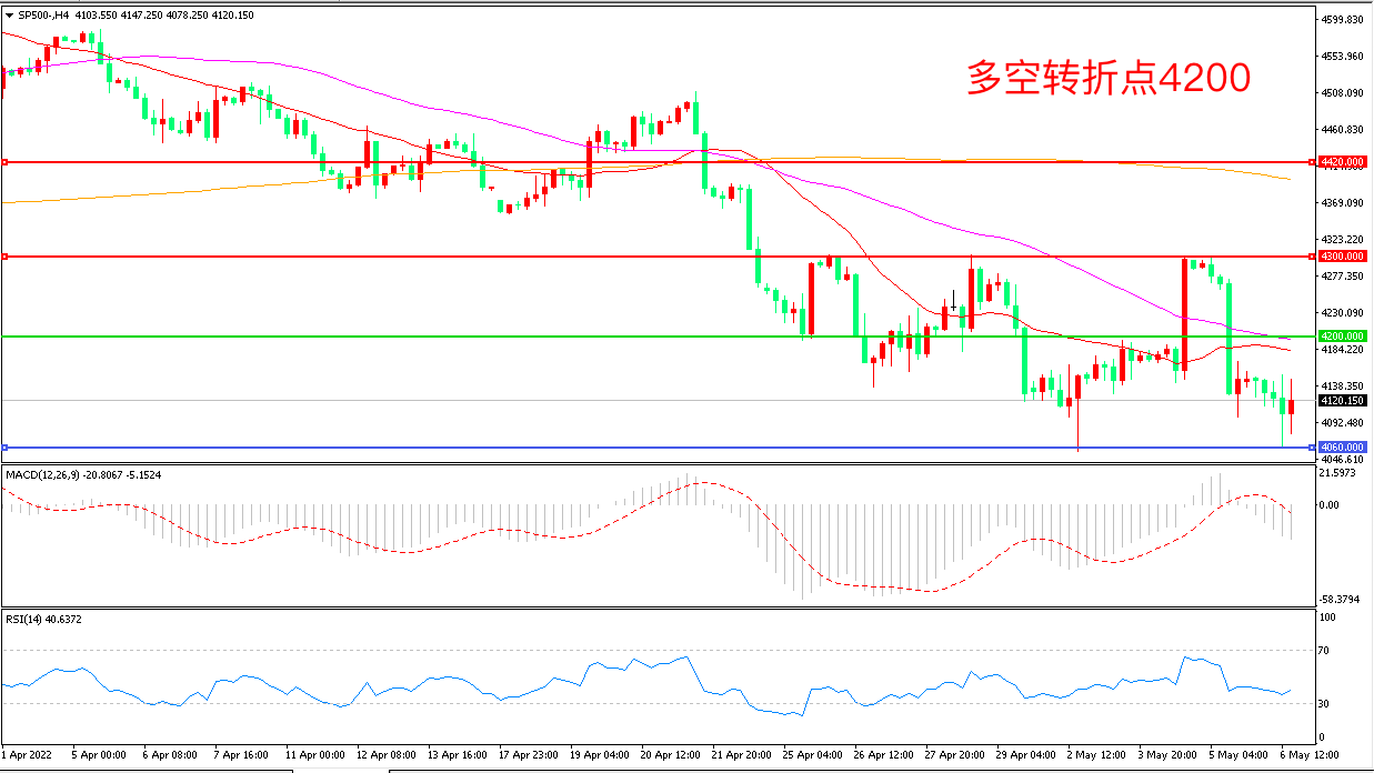4小时图看,标普500长阴下破后再度下行,短线走势偏空,4060成为短线支撑,4200成为多空分水岭,MACD绿柱增加,RSI指标走平,日内延续震荡概率较大。