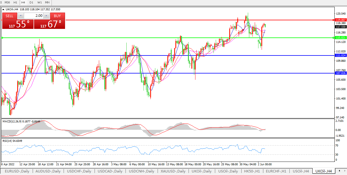 4小时图看,油价迅速拉升,短线走势仍旧坚韧, MACD量能柱缩短,RSI指标再度回升,日内延续高位宽幅整理概率较大。