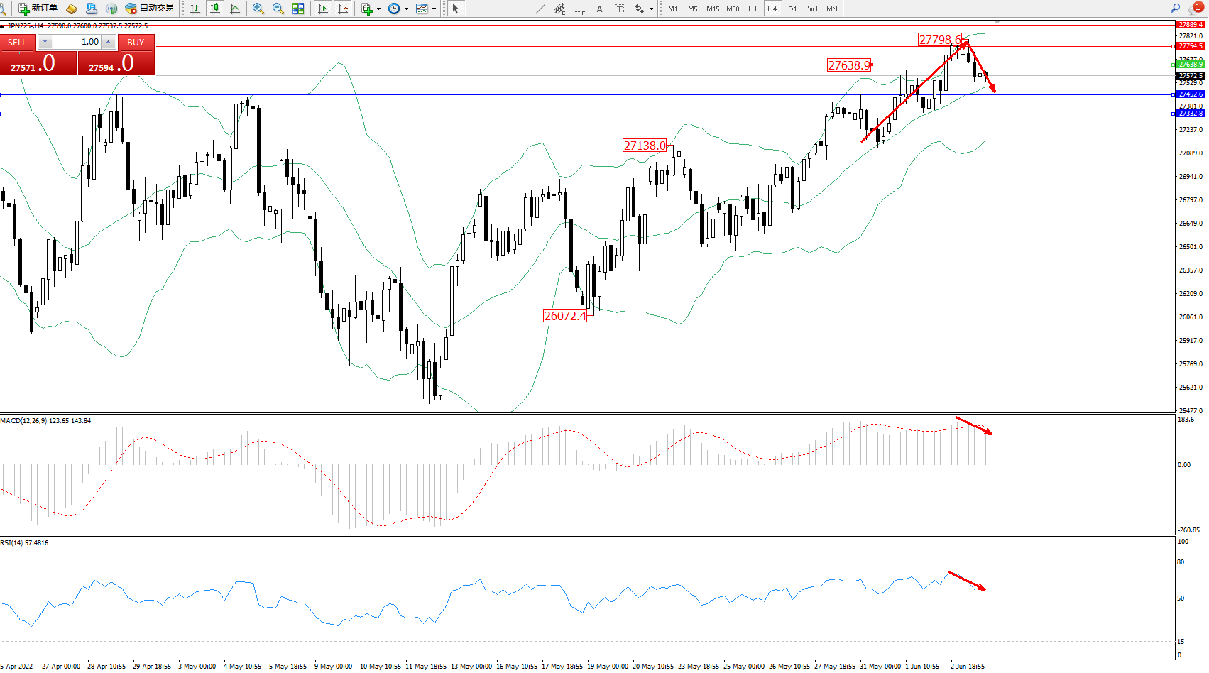 日经指数JPN225——4小时K线图显示: