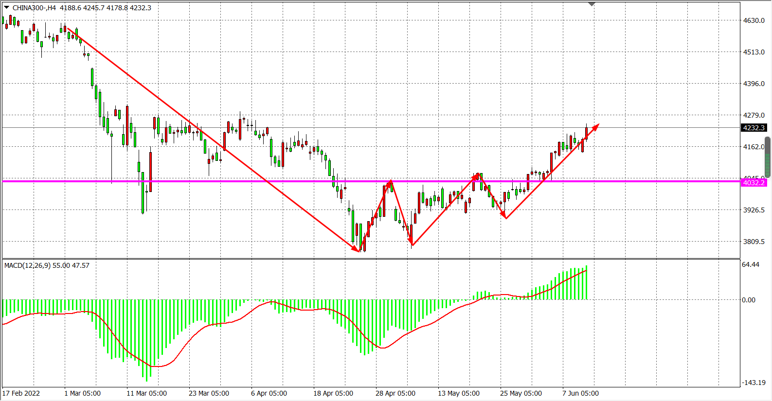 4小时图看,沪深300强势上破4180,再度打破压制创出新高,趋势持续底部反弹,MACD柱体于零轴之上不断放量,预示价格有望进一步走高。