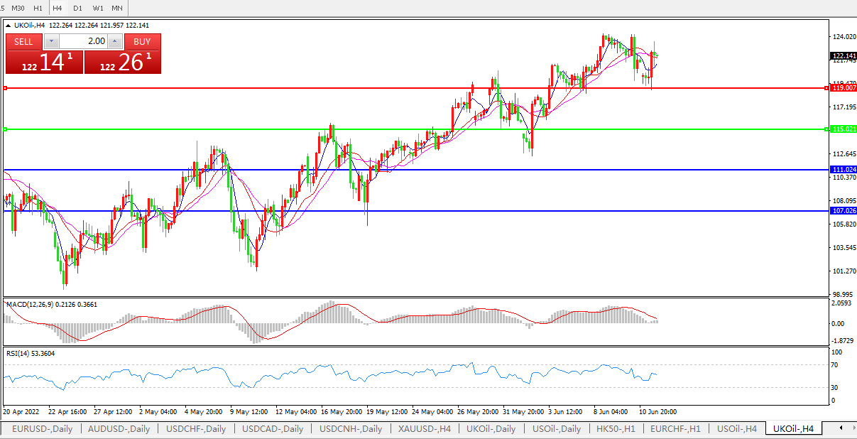 技术面简析:4小时图看,油价高位盘整,短线走弱后迅速拉升 MACD量能柱动能不足RSI指标整理走强,日内继续走强概率较大。