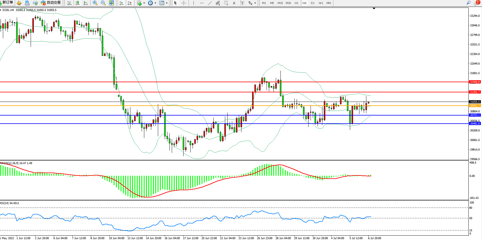 道琼斯指数DJ30——4小时K线图显示:
