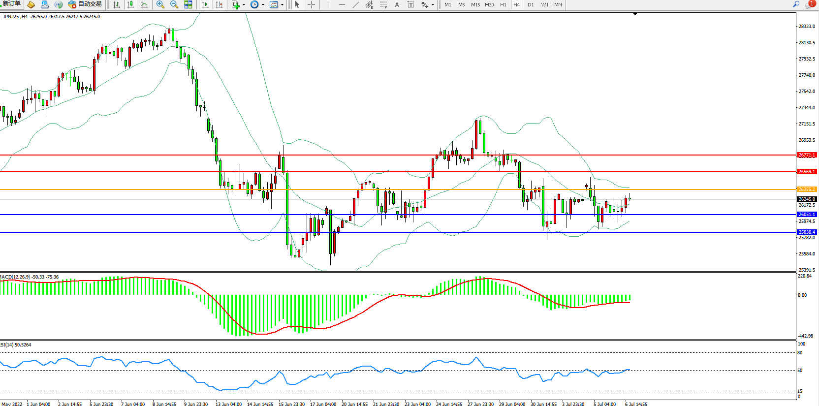 日经225指数7月6日(周三)收盘下跌313.97点,跌幅1.19%,报26109.50点。日本经济产业省表示,日本将从周四开始支付40.8日元/升的汽油补贴;奥密克戎BA.5来势汹汹,东京5日新增5302例新冠确诊病例,日本政府厚生劳动省要求各地方政府,持续确保专责病床数量与筛检量能等。