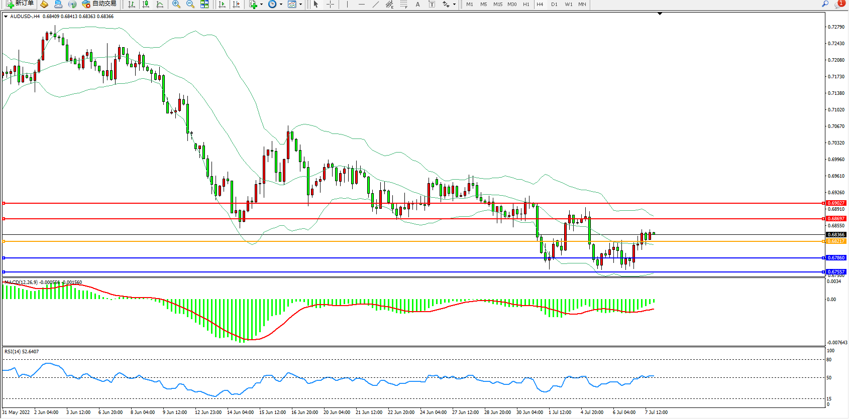 交易策略:0.68217上方看涨,目标0.68697、0.69027