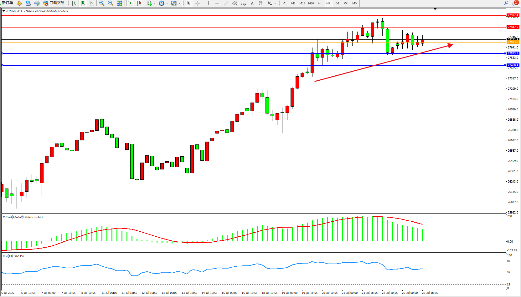 日经指数JPN225——4小时K线图显示: