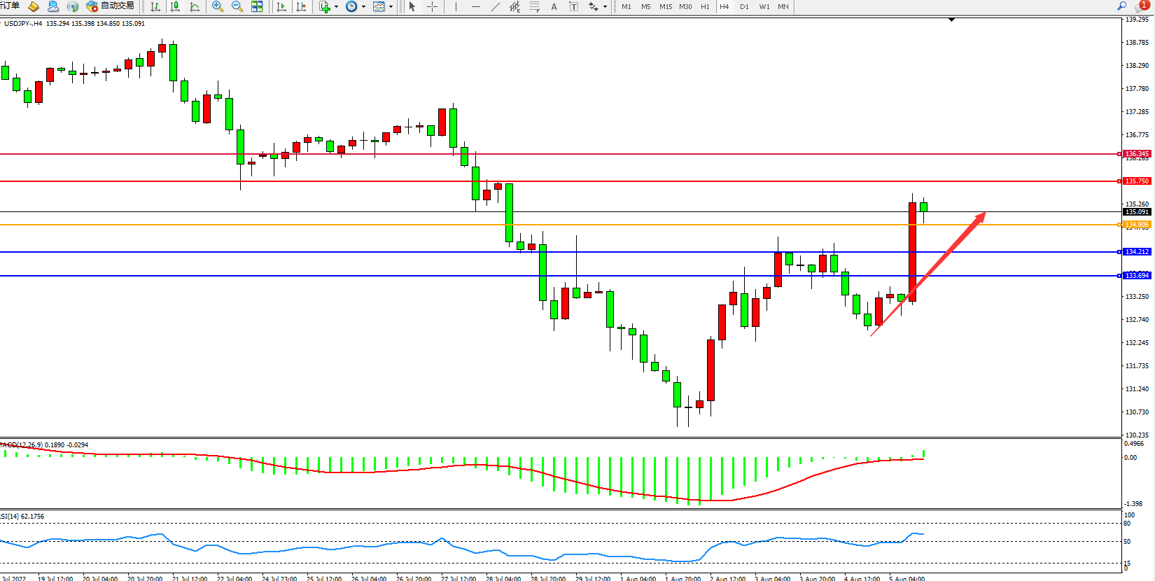 交易策略:134.806上方看涨,目标135.750、136.345