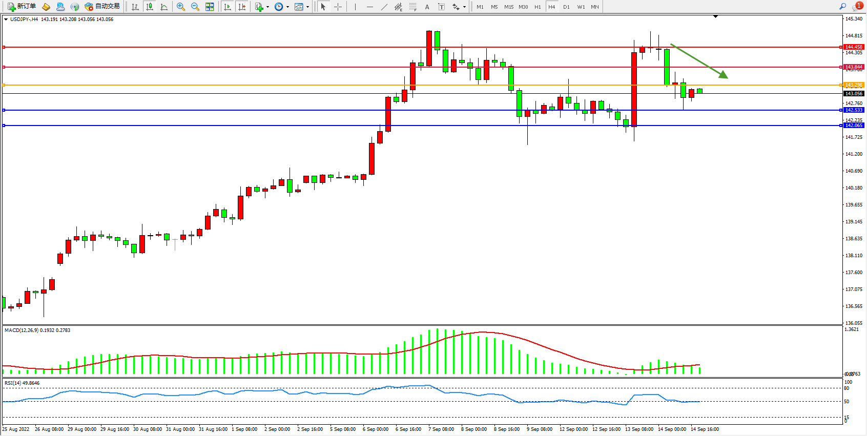 交易策略:143.298下方看跌,目标142.533、142.065