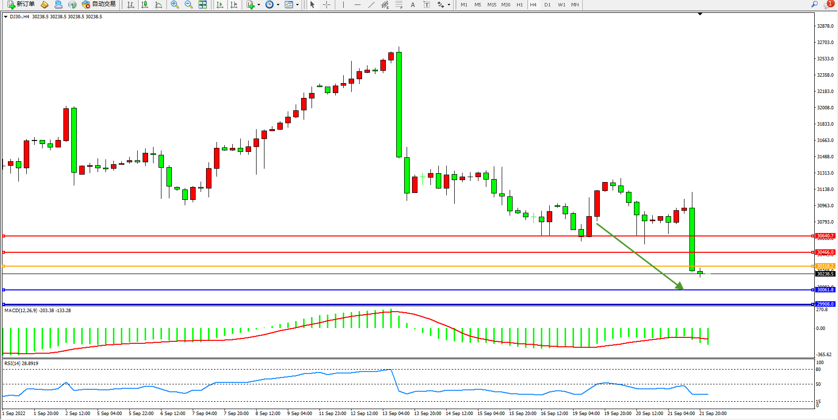道琼斯指数DJ30——4小时K线图显示: