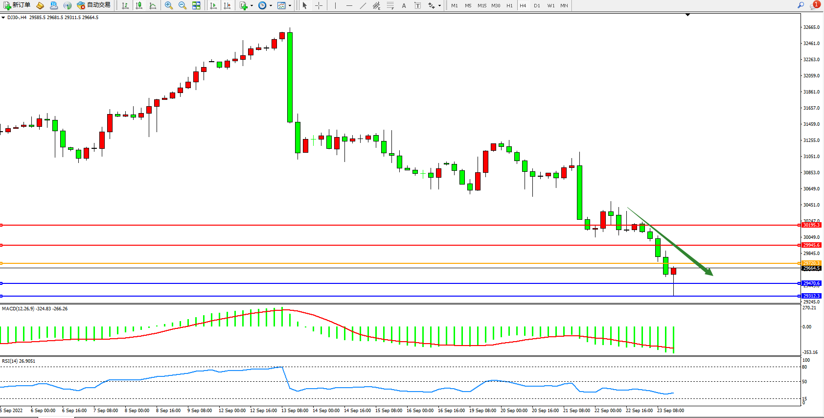 道琼斯指数DJ30——4小时K线图显示: