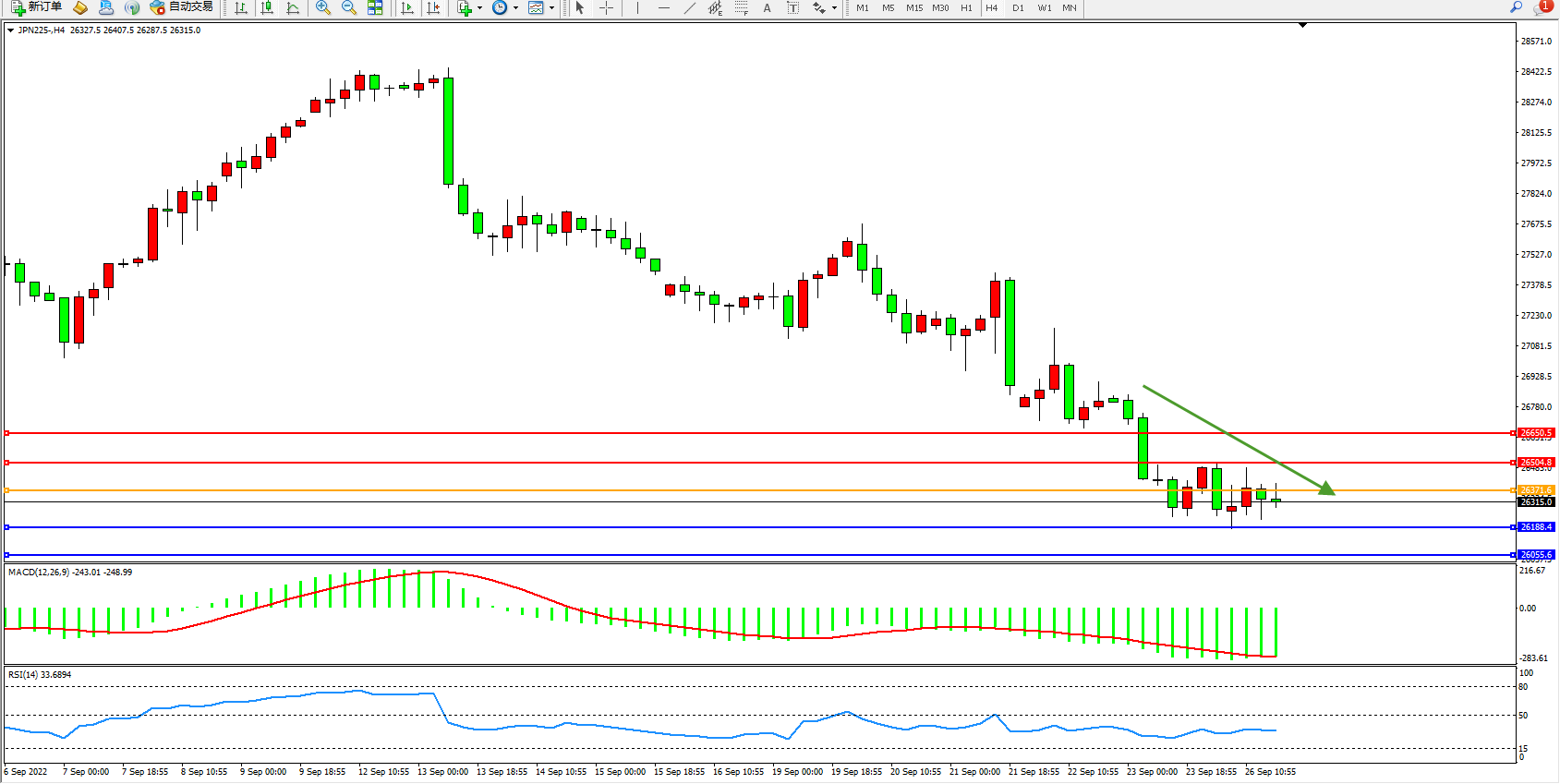 日经指数JPN225——4小时K线图显示: