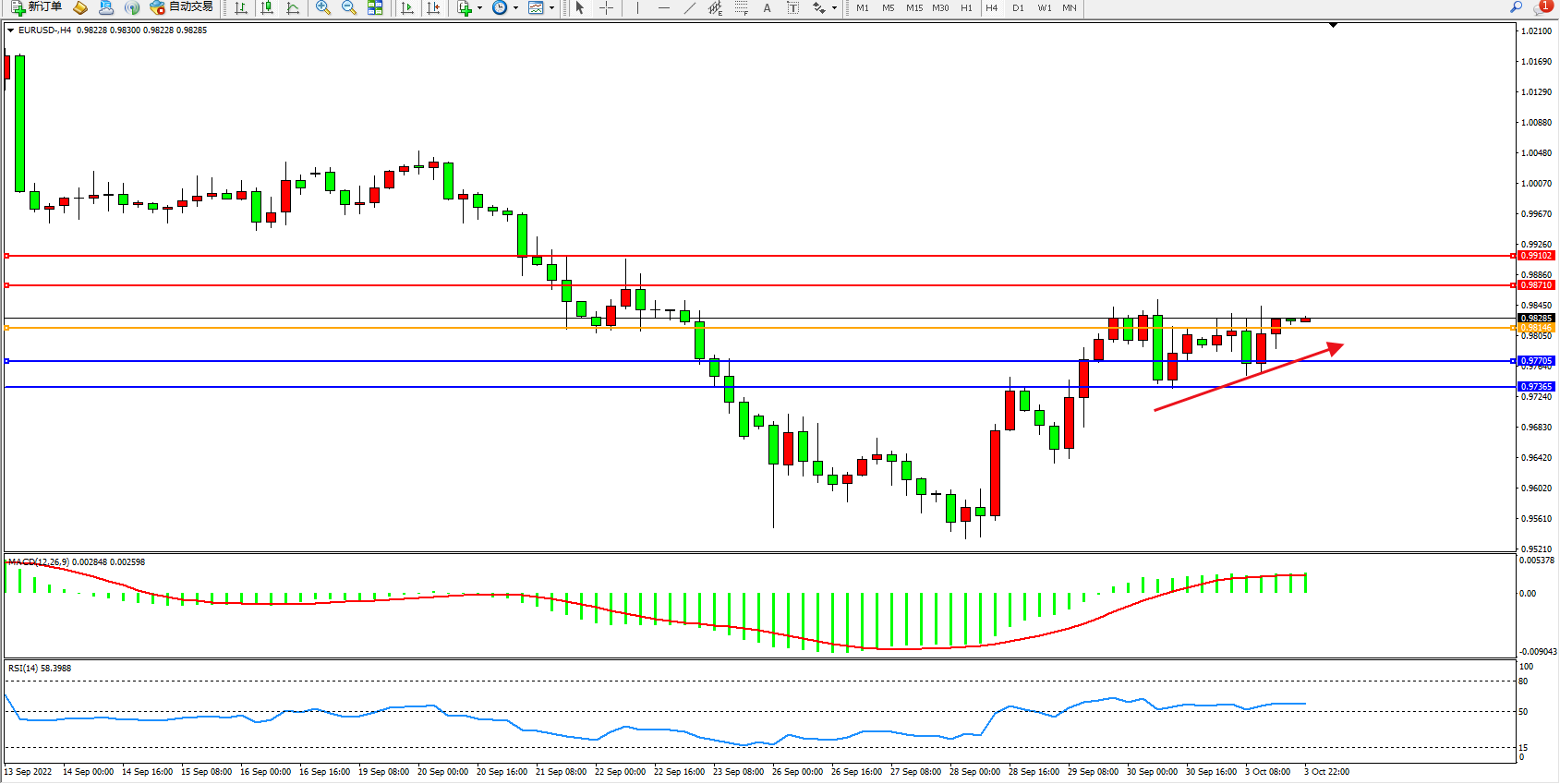 交易策略:0.98146上方看涨,目标0.98710、0.99102