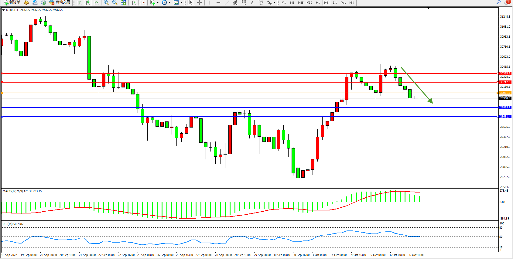 道琼斯指数DJ30——4小时K线图显示: