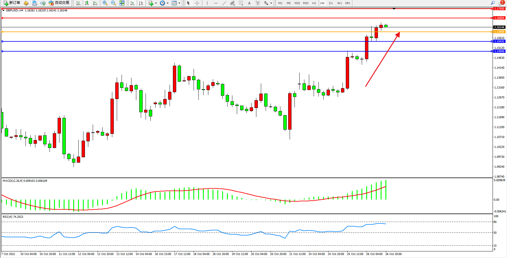 英镑美元GBPUSD ——4小时K线图显示: