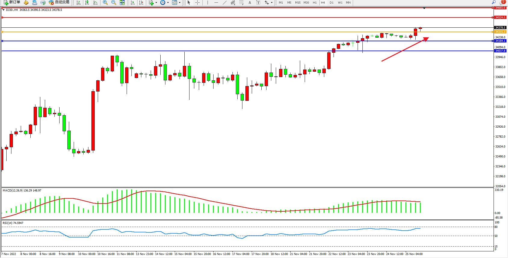 道琼斯指数DJ30——4小时K线图显示: