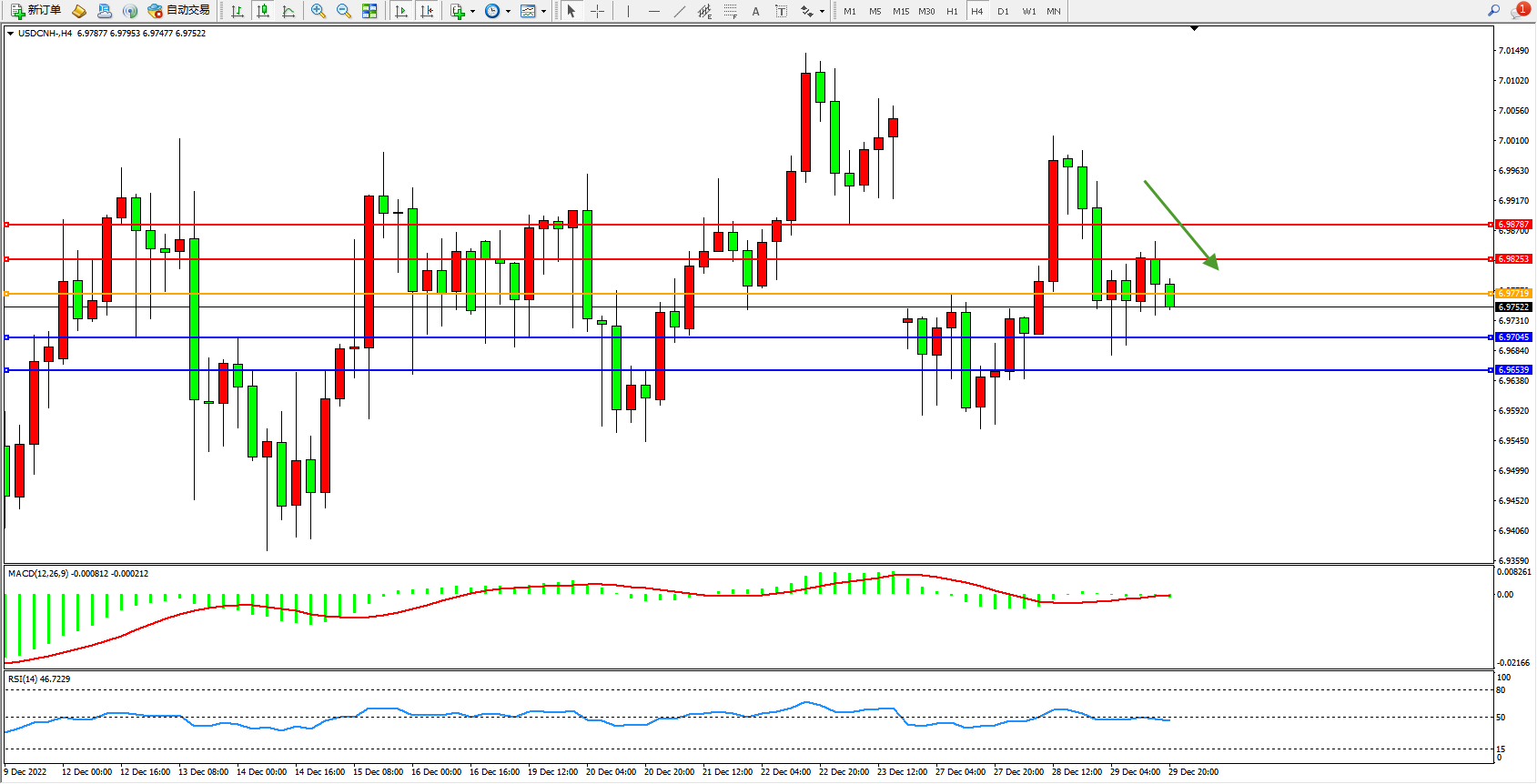交易策略:6.97719下方看跌,目标6.97045、6.96539