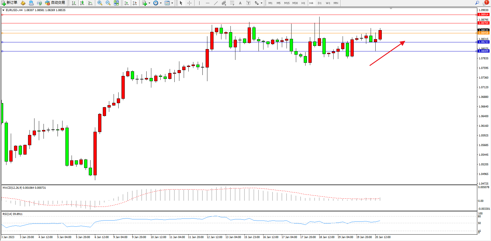 交易策略:1.08458上方看涨,目标1.08704、1.08914