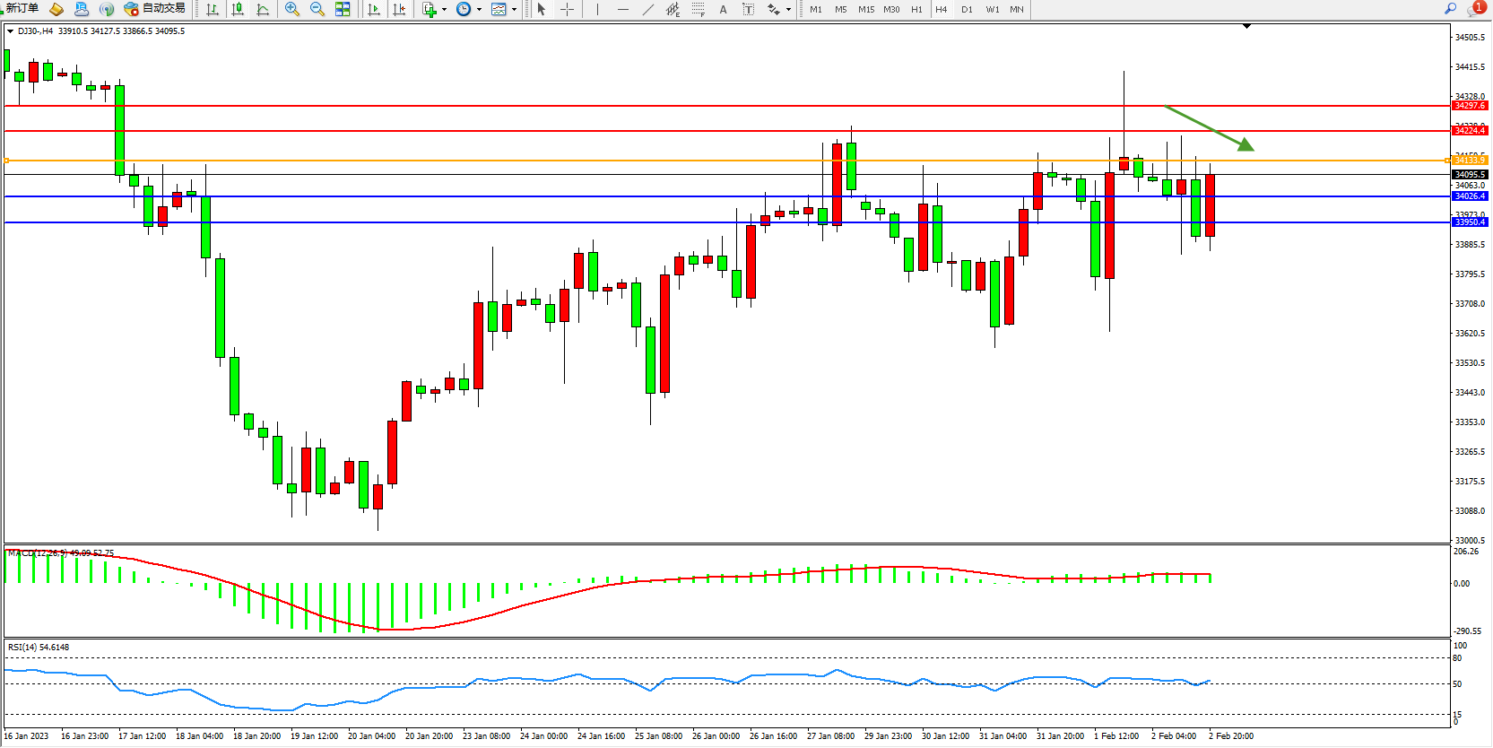 道琼斯指数DJ30——4小时K线图显示: